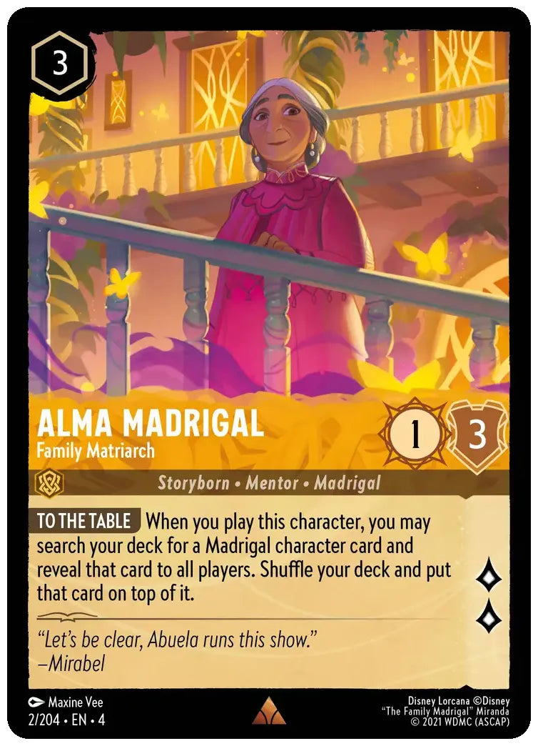 When you play this character, look at your deck. You may reveal a Madrigal character card. Shuffle your deck and put that card on top of your deck.