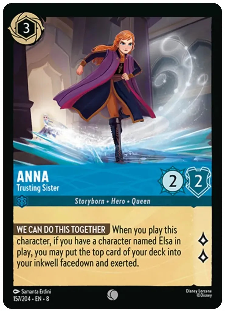 When you play this character, if you have a character named Elsa in play, you may put the top card of your deck into your inkwell facedown and exerted.