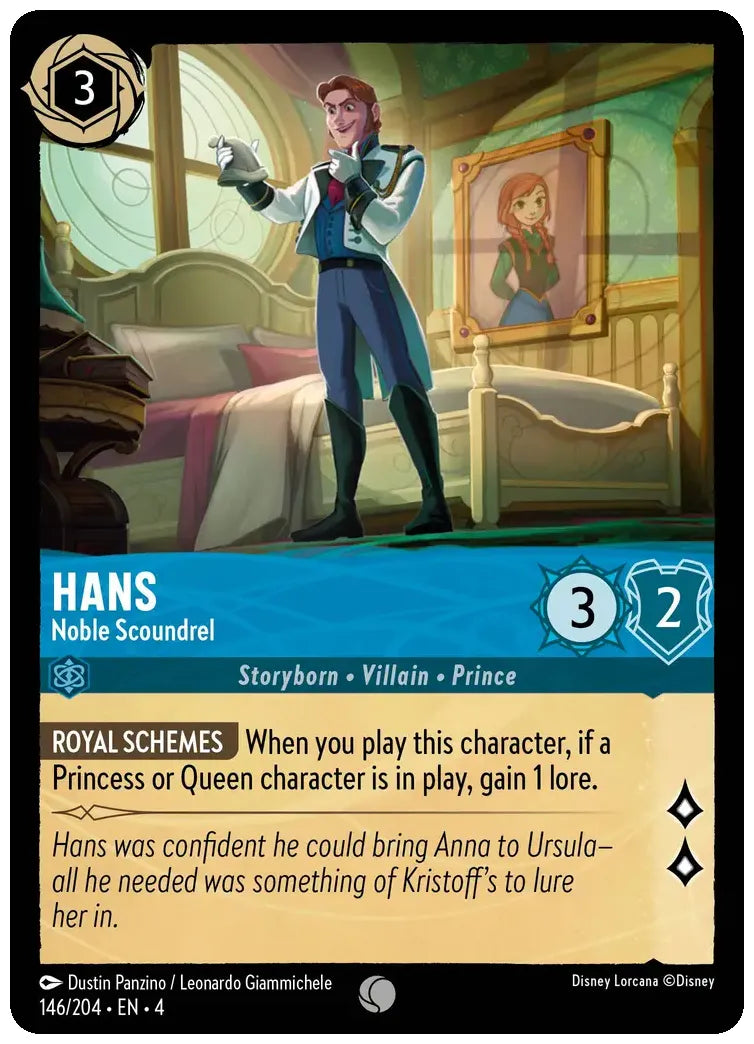 When you play this characer, if a Princess or Queen character is in play, gain 1 lore.