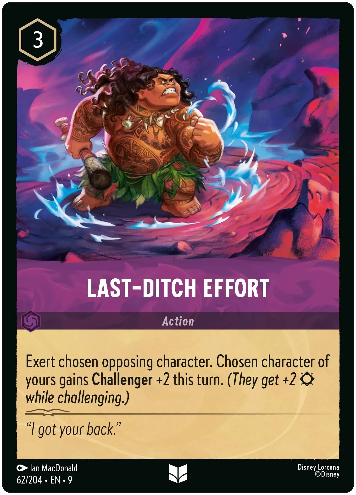 Exert chosen opposing character. Chosen character of yours gains Challenger +2 this turn. (They get +2 Power while challenging.)