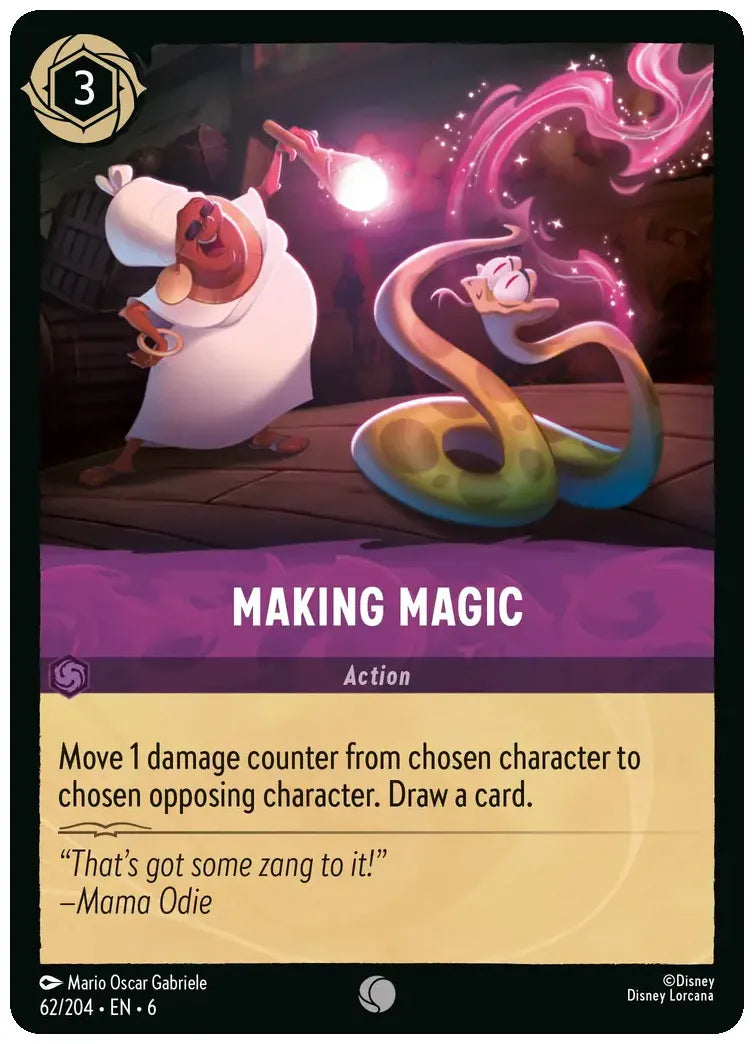 Move 1 damage counter from chosen character to chosen opposing character. Draw a card.
