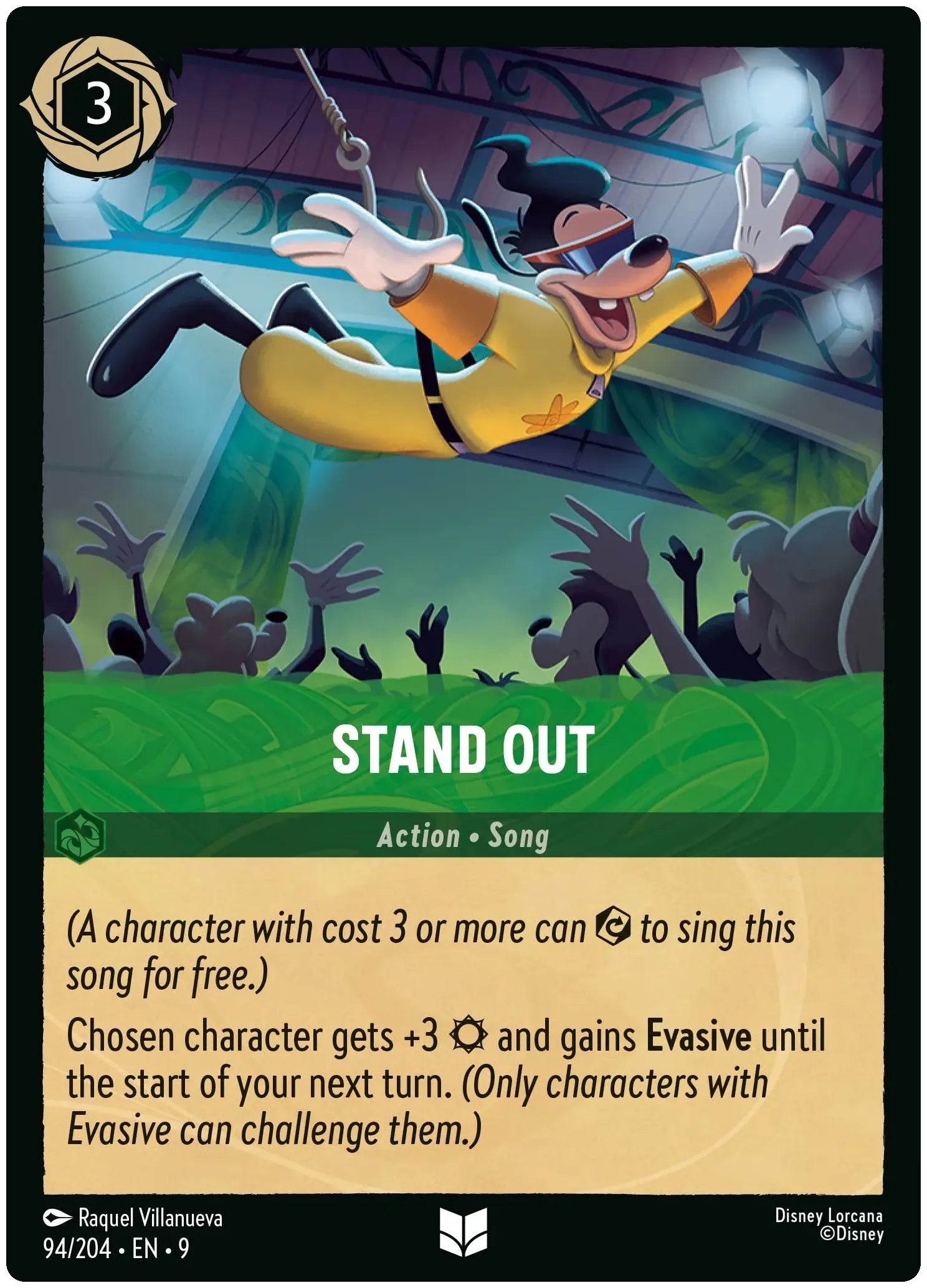 Chosen character gets +3 Power and gains Evasive until the start of your next turn. (Only characters with Evasive can challenge them.)