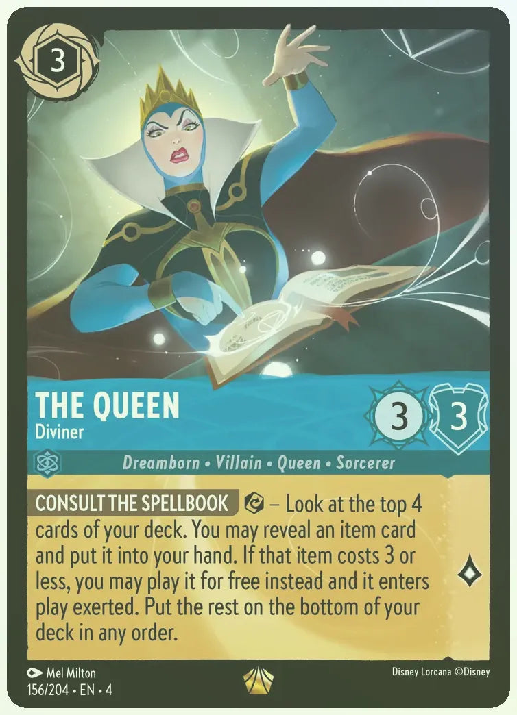 Exert – Look at the top 4 cards of your deck. You may reveal an item card and put it into your hand. If that item card costs 3 or less, you may play that item for free and it enters play exerted. Put the rest on the bottom of your deck in any order.