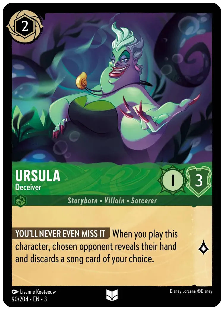 When you play this character, chosen opponent reveals their hand and discards a song card of your choice.