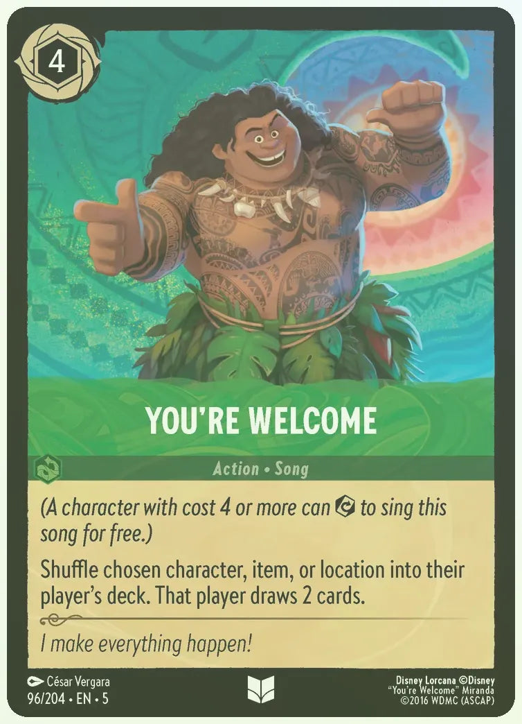 Shuffle chosen character, item, or location into their player's deck. That player draws 2 cards.